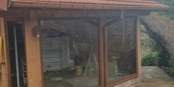 Fermeture d’une extension ossature bois avec menuiseries PVC chêne doré deux faces, entièrement sur mesure ...